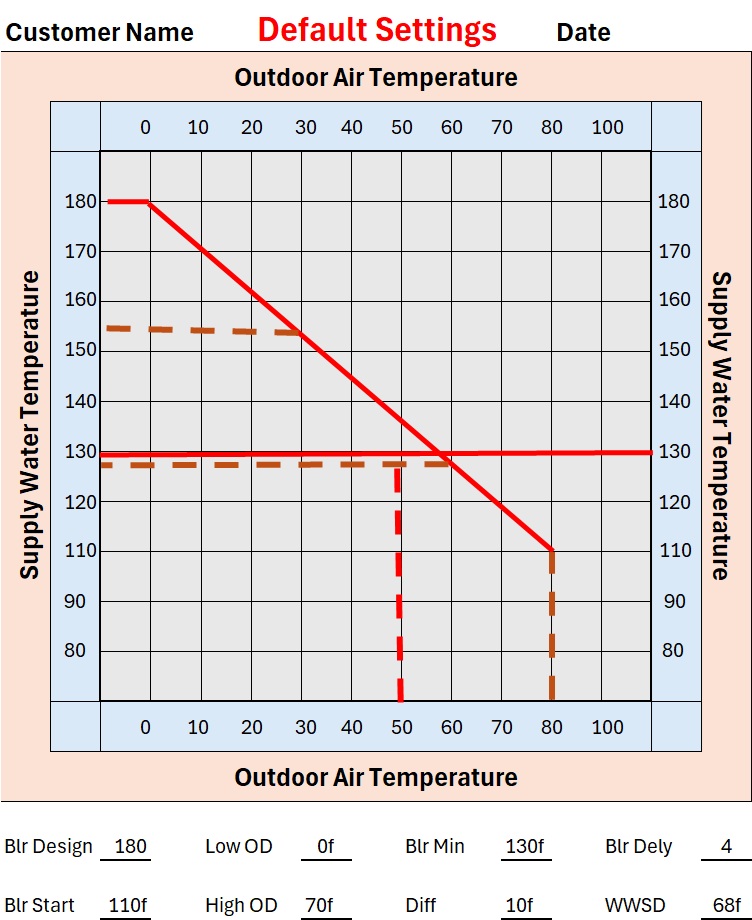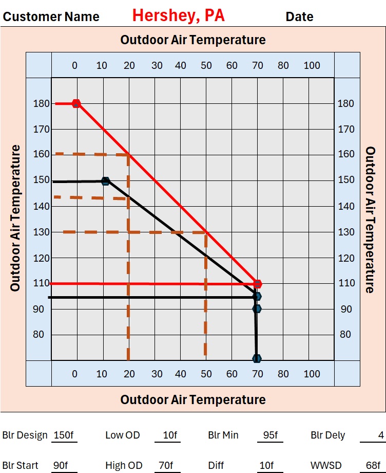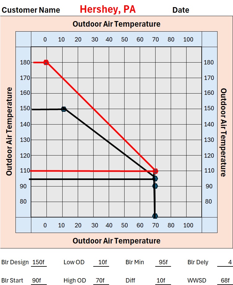 This is how we plotted the heating curve to set our control. You will see from the example that the water temperature at 70F outdoor air temperature is 95F. If the outdoor air temperature drops to 10F, the system water temperature will be 140F. While this is a good temperature, it is not a bad idea to increase it 5-10 degrees. The outdoor air temperatures and water temperatures can all be changed to fit any scenario.