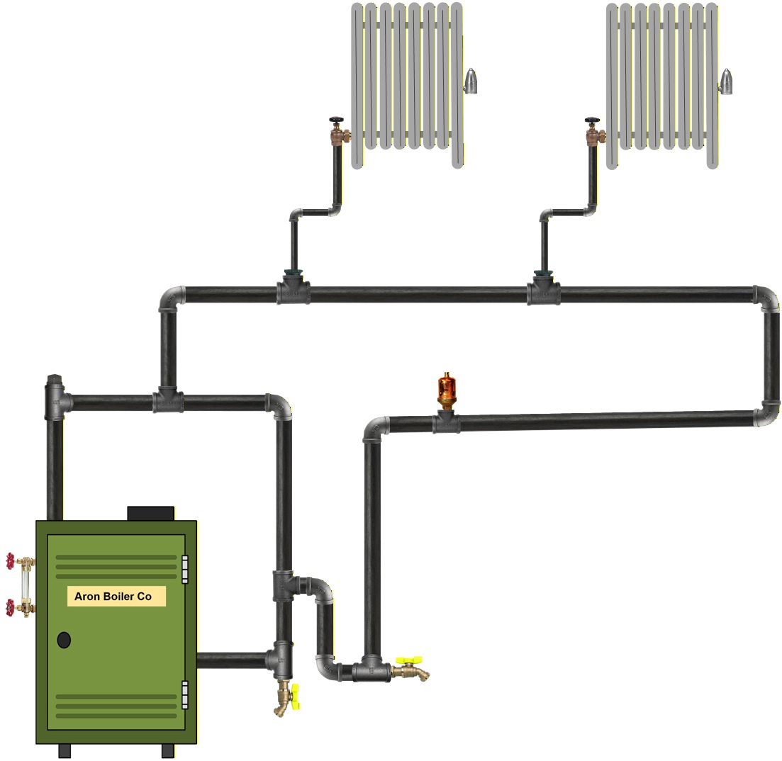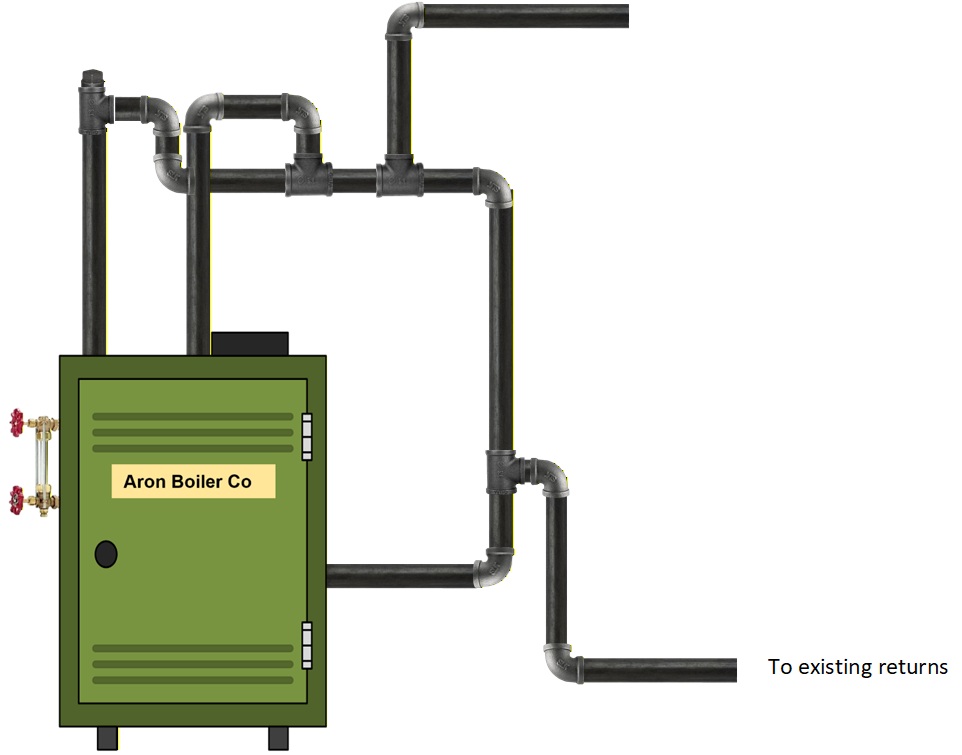 I am not a huge fan of adding chemicals to a residential boiler. When adding chemicals to a steam boiler, it is essential to follow the manufacturer's instructions from the chemical and boiler manufacturers precisely. Not following these directions could change the pH of the water, causing more issues. Many steam boilers do not offer a good way to get the chemicals into the boiler, especially powders like Squick. Making this chore easier will mean considering this option during the installation process. I would suggest adding a tee and a plug to a boiler riser. Verify there is no steam pressure on the system, then remove the plug to allow the chemical to drop directly into the boiler. Fire up the boiler and allow it to warm up while circulating the chemical around the boiler. Below is the suggested piping on a single riser. If using a dual riser, choose either boiler riser to add the tee and plug for chemical addition.